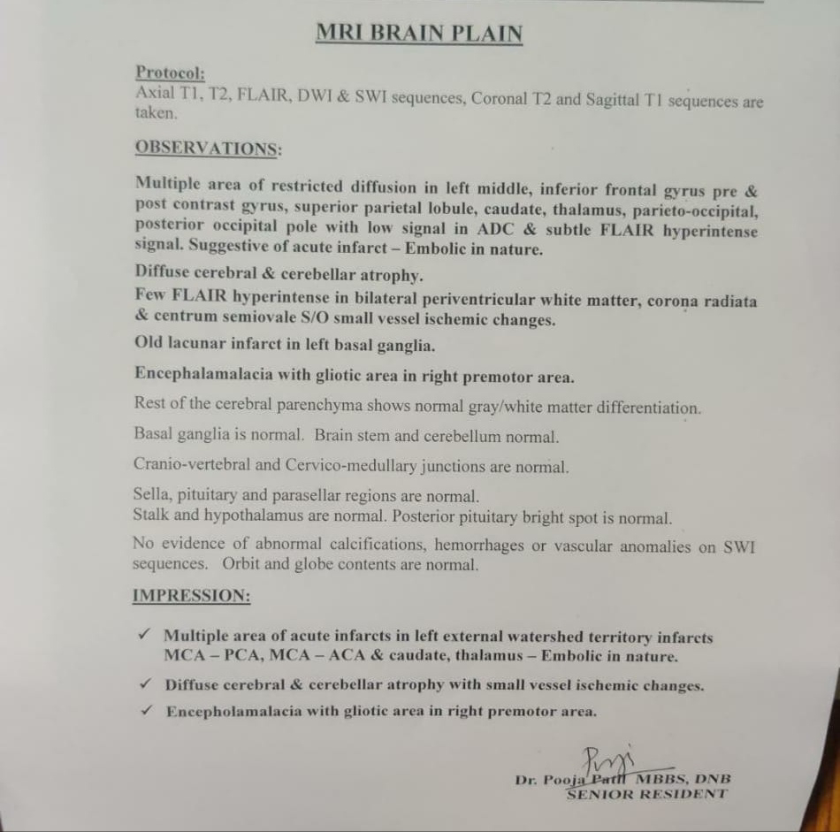 CVA, RIGHT HEMIPARESIS, ATS, MULTIPLE INFRACTS ON MRI IMAGING